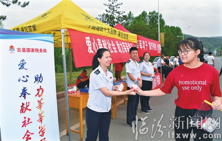 临汾新闻网讯 高考期间,古县国税局志愿者服务队开展“爱心奉献社会 助力莘莘学子”活动,为考生们准备了橡皮擦、矿泉水、风油精等物品,给他们加油鼓劲。