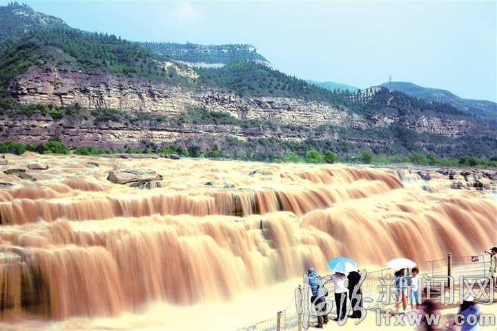 临汾新闻网讯 受黄河上游降雨量的增多和水库泄洪影响,近日,吉县壶口瀑布水量增大,瀑布成群,迎来一年中的最佳观赏期。图为游客观赏壶口瀑布的壮美景观。