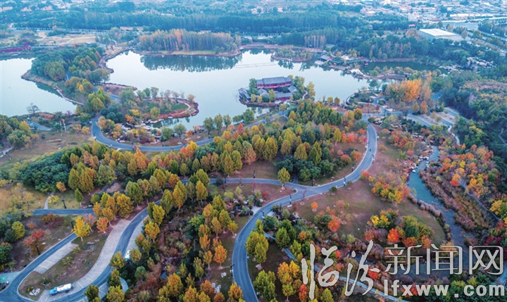 深秋时节,市区涝洰河生态公园斑斓如画,透过航拍镜头看到,连片的黄叶、红叶为公园披上浓妆,犹如一个彩色的画廊,令人流连忘返。