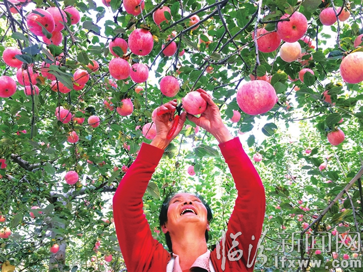 临汾新闻网讯 近日,尧都区县底镇道东村的苹果进入丰收季。果园里,苹果满树、高挂枝头,村民们抓紧时间采摘,抢时上市,一派忙碌的景象。图为该村村民在采摘苹果。