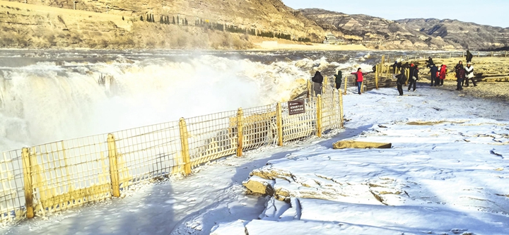 据壶口景区相关负责人介绍,近来受天气影响,瀑布两岸的岩石和护栏上出现了美丽的冰挂。太阳出来后,在瀑布上方还会出现彩虹,为冬日的壶口瀑布平添了几分秀色。在大面积冰挂流凌美景的衬托下,波涛汹涌的壶口瀑布更为壮观。