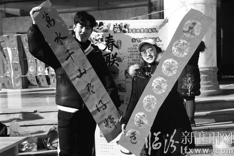 临汾新闻网讯 山西师范大学书法学院、书法爱好者协会日前在校科学会堂前举办了“挥毫泼墨送春联,龙飞凤舞迎新春”送春联活动。十多名师生免费为大家手写春联,送祝福,共为师生们送出500余副对联,此举得到了师生们一致好评。