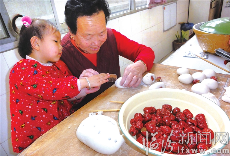 临汾新闻网讯 1月28日,襄汾县85岁的杜兰英老人正和3岁的小重孙做“兔儿馍”。