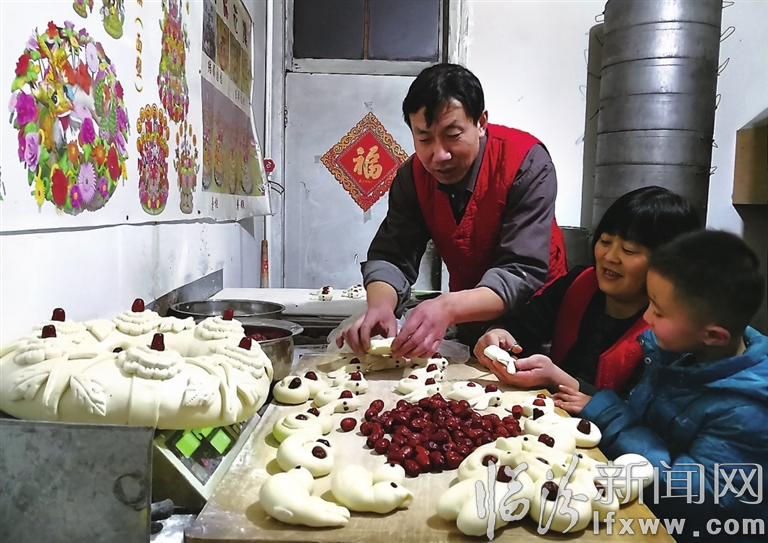 2月1日,在尧都区席家胡同襄汾太平面塑花馍店,徐瑞玲一家在制作年馍。