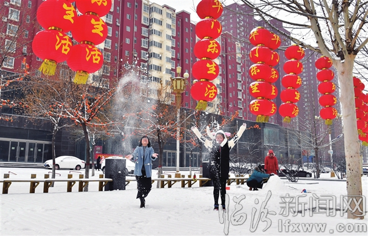 图①:在市区漪汾花园小区,居民正在花园里戏雪。