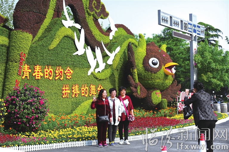 临汾新闻网讯 连日来,随着二青会花样滑冰比赛项目的火热进行,赛场外的二青会元素也成为一道道靓丽的风景线,备受市民欢迎。图为在市区廉政广场入口,市民与二青会主题立体花坛合影留念。