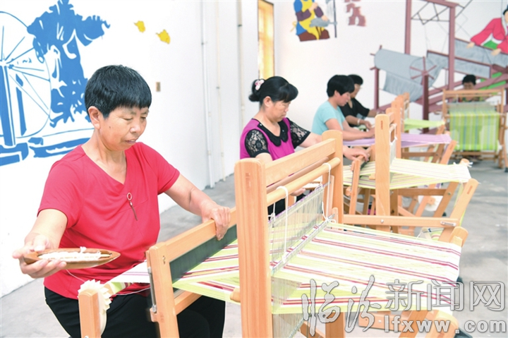 临汾新闻网讯 洪洞县山西槐乡手工纺织品有限公司在该县石南村建立粗布加工基地,为当地35户建档立卡贫困户提供手工织布机50台,并对她们进行技术培训,让她们足不出户就可就业赚钱。图为7月17日,农户们正忙着加工粗布。