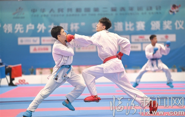 临汾新闻网讯 8月4日,第二届全国青年运动会空手道比赛体校组开赛,来自全国各地体校的运动员展开了激烈角逐。图为参赛选手在进行比赛。