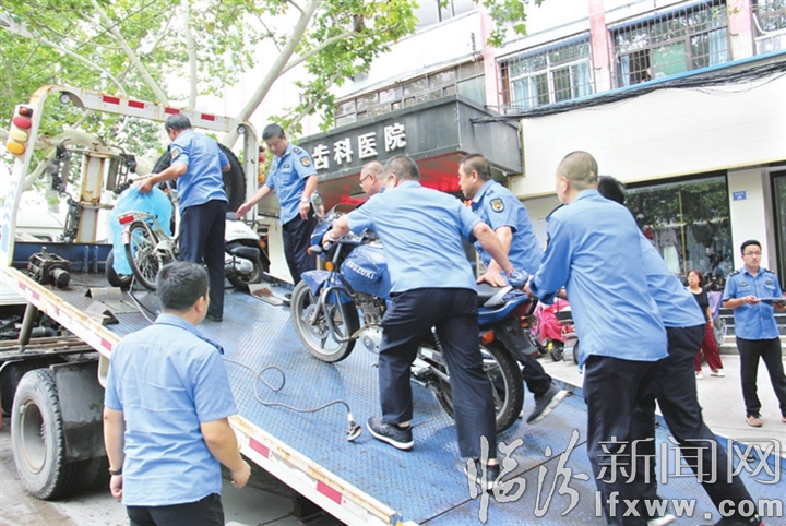 图为执法人员在清理乱停乱放的车辆。