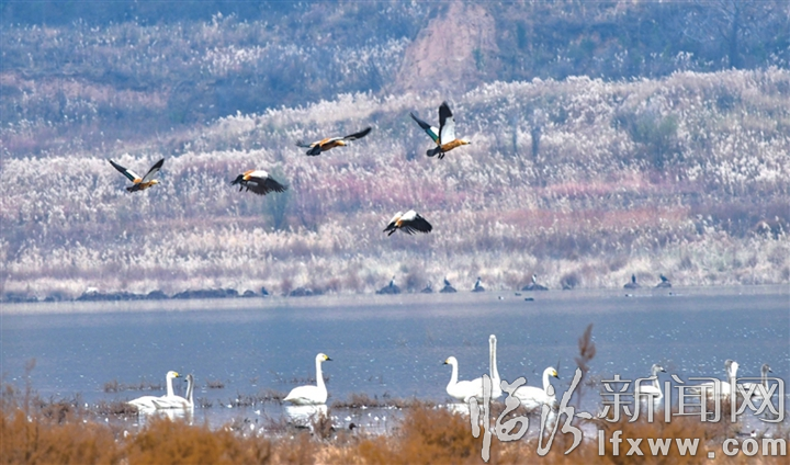 临汾新闻网讯 近日,翼城县王庄乡小河口水库迎来一批特殊的“客人”,一群身姿优雅、体态婀娜的白天鹅在湖面上尽情地展现它们美丽的风姿。它们时而徘徊游弋,时而翩翩起舞,时而引吭高歌,给小河口水库平添了一道亮丽的风景。