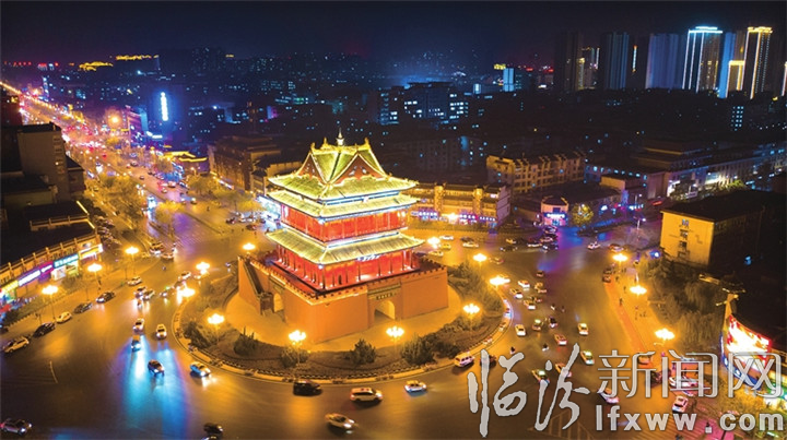 临汾新闻网讯 图为12月11日航拍镜头下的鼓楼夜景。绚丽多彩的霓虹灯点亮了夜空,让这座拥有着古老文明底蕴而又现代化气息十足的城市活力迸发、魅力四射。