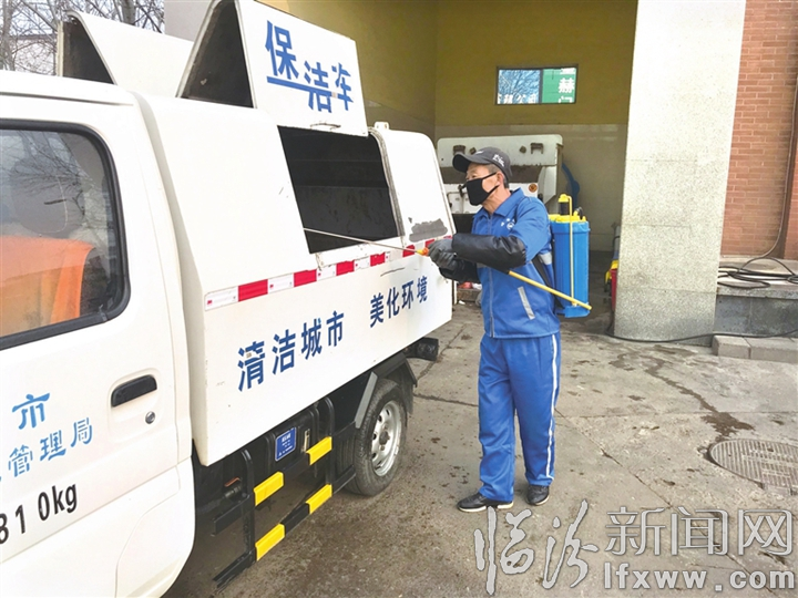 临汾新闻网讯 疫情防控期间,我市环卫部门为有效切断病毒传播途径,加强了设施的消毒工作。图为环卫工人在为垃圾清运车辆消毒。