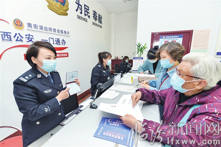 临汾新闻网讯 3月27日,市公安局直属分局南街派出所民警在综合服务厅为办理户籍业务的居民讲解注意事项。该分局“一门通办”综合业务启动后,群众可无差别办理出入境、交管等27项业务,真正享受到了“只进一个门、办结所有事”。