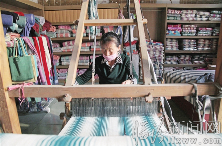 临汾新闻网讯 近日,在襄汾县丁村民俗博物馆景区内,一工人正在用传统织布机织土布。