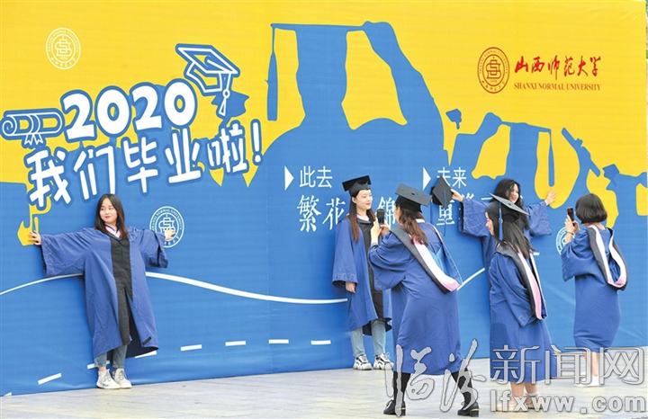 临汾新闻网讯 5月8日,山西师范大学即将毕业的学生正在毕业版面前拍照留念。