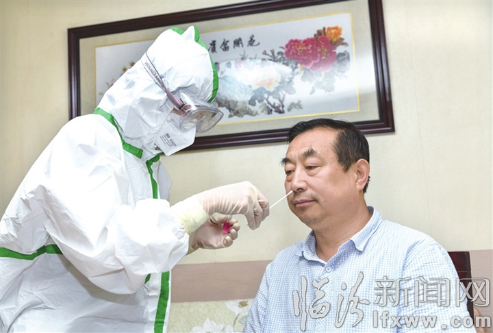 图为5月16日,工作人员为张建国做鼻拭子检测。
