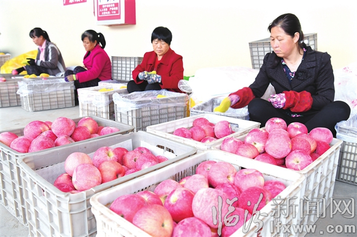 临汾新闻网讯 吉县超正果业有限责任公司采取”公司+基地+农户”的产业化运营模式,以苹果经纪人为枢纽,连接果农和果商,果农的苹果通过市场交易由果商直接销往上海、广东、广西等大型超市和市场,有效带动当地果农增收。图为工人们正在进行苹果分级分拣。