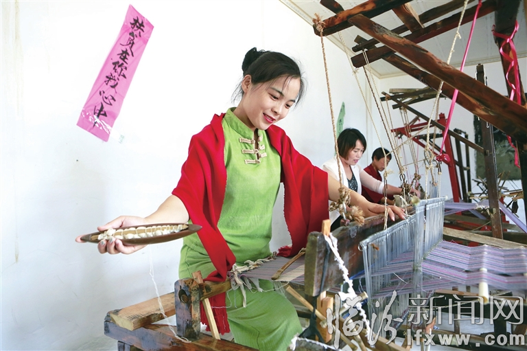 临汾新闻网讯 90后大学生刘小瑞是洪洞县万安镇人,从北京辞职返乡后创业成立公司,传承发展家乡手工艺文化遗产,通过线上线下直播销售土特产品,增加农民收入。 图为5月31日,在洪洞县甘亭镇士师村扶贫车间,刘小瑞(前)与织娘们上机织布。