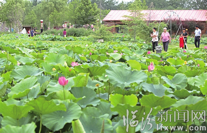 临汾新闻网讯 盛夏时节的襄汾县燕村荷花公园里,塘中荷叶舒展优美、荷花鲜艳娇嫩,美不胜收。图为6月26日,游人在燕村荷花公园赏荷游玩。