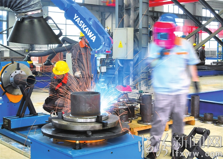 临汾新闻网讯 8月8日,在位于临汾甘亭产业孵化园区的山西三水能源股份有限公司标准化生产车间里,全自动焊接机器人正在焊接法兰。