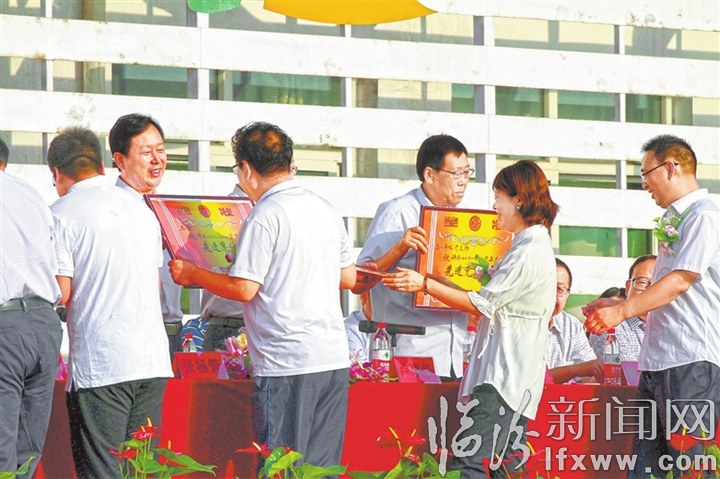 临汾新闻网讯 9月9日,临汾一中表彰2019—2020学年度优秀集体和个人,喜迎第36个教师节到来。图为该校领导为先进集体颁奖。