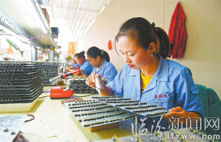 临汾新闻网讯 9月10日,大宁县鑫辉电子元件制造有限公司生产车间内,工人们正在加紧生产。该公司采取“生产线下乡扶贫”模式,分别在大宁县徐家垛乡南桑峨村、三多乡刘家庄村以及曲峨镇曲峨村建成并投产了3条扶贫生产线,提供就业岗位800个,有效促进了大宁经济发展。