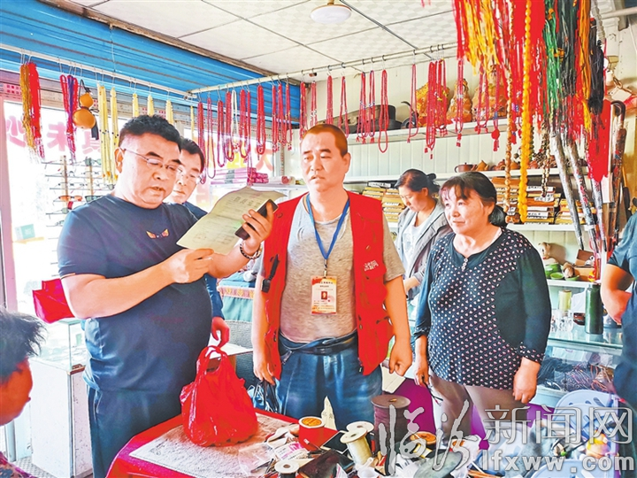 临汾新闻网讯 近日,尧都区社会化服务网格中心的社会监督员深入尧庙景区开展社会监督活动,查找景区存在的问题,并向主管部门反馈,督促尽快解决。图为监督员在一家违建商户了解情况。
