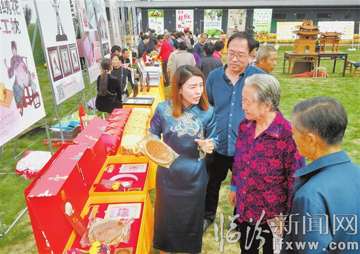 临汾新闻网讯 9月21日,侯马市“庆丰收、迎小康”农民丰收节暨首届菊花文化创意展在该市高村乡上平望村艺农菊花种植园举行。其中优质农副产品及特色文创产品展销成为此次活动的亮点。图为非遗传承人苏丽丽正在向游客介绍极具晋文化特色的中秋礼盒文创产品。