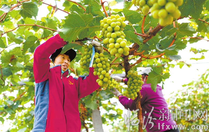 临汾新闻网讯 近日,在襄汾县广奇农业生态园内,员工们正在采摘“阳光玫瑰”葡萄。近年来,该县大力发展葡萄种植,推广新技术,引进新品种,形成了以巨峰、夏黑、红提、阳光玫瑰等为主导品种的多样化和规模化种植格局,在促进葡萄产业提质增效的同时,有效带动了当地农民增收致富。