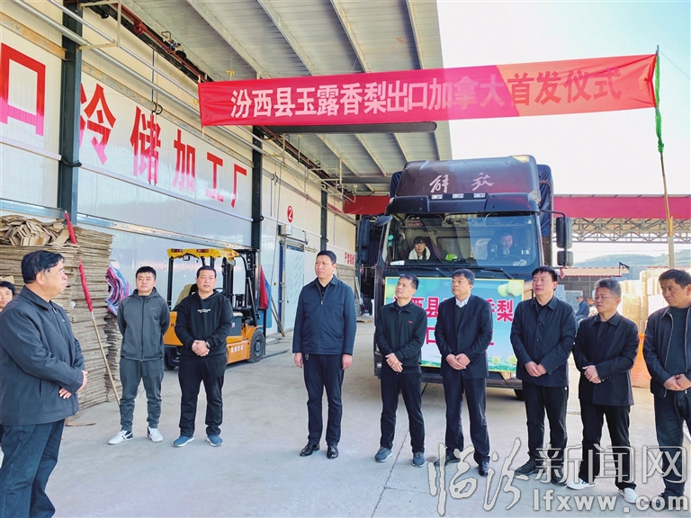 临汾新闻网讯 10月18日,汾西县玉露香梨出口加拿大首发仪式举行,这是该县高寒农牧专业合作社玉露香梨首次走出国门。该合作社玉露香梨园占地近3000亩,所产玉露香梨含糖量高,品质品相好,是农业农村部确定的“国家现代农业科技示范展示基地”、省农业农村厅确定的“玉露香梨国家出口基地”。在该合作社的示范带动下,周边乡镇发展梨园面积达万余亩,成为当地农民增收致富的主导产业。图为汾西县有关领导参加首车发货仪式。