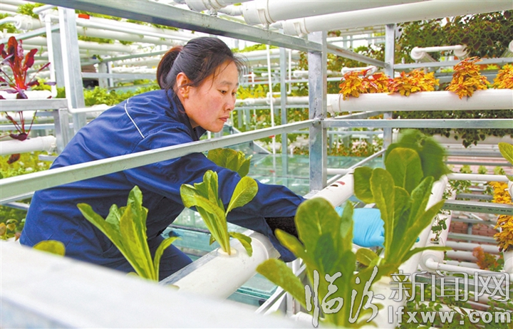 临汾新闻网讯 11月17日,在曲沃县智慧果蔬产业示范园区,工作人员在无土栽培紫罗莎生菜。近年来,曲沃县积极发挥区域资源优势,大力发展智慧农业,推动了果蔬产业转型升级。