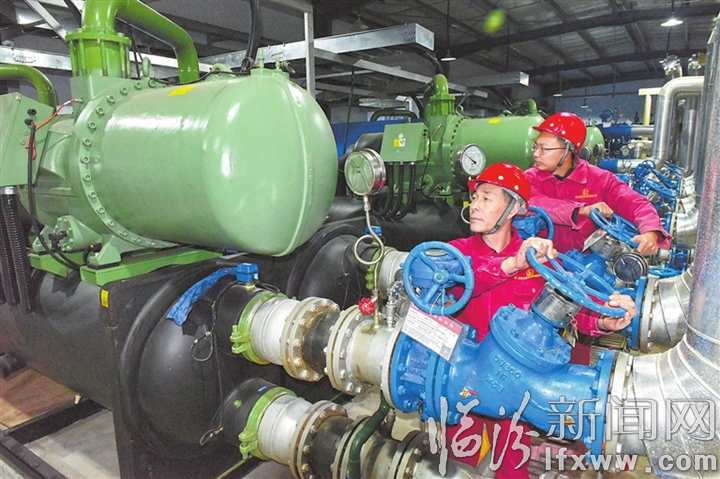 临汾新闻网讯 11月28日,中石化新星双良地热能热电有限公司曲沃分公司工作人员正在启动水(地)源热泵机组。该公司利用地热能开发核心技术,实现了地热资源的梯级综合利用,通过换热设备加热供暖循环水,达到节能环保供热。