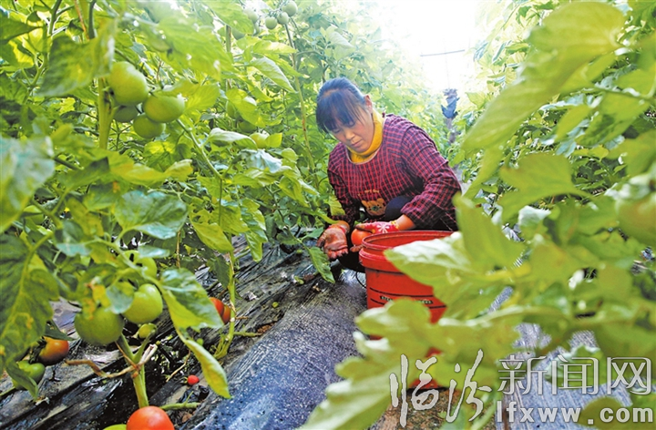 临汾新闻网讯 12月13日,在襄汾县永固乡万宁村的温室大棚内,村民在对西红柿进行管护与采摘。