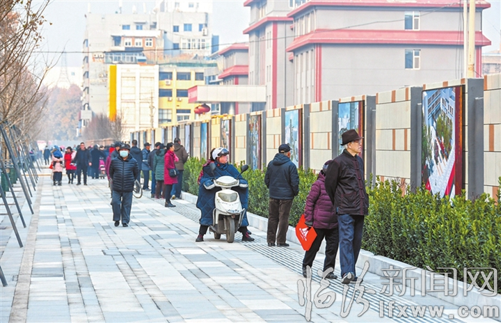 临汾新闻网讯 12月21日,市民在市区解放路观看文化墙。解放路改造通车后,交通顺畅、环境优美,既保持了传统风格,又增添了现代气息,成为一条独具特色的城市道路。