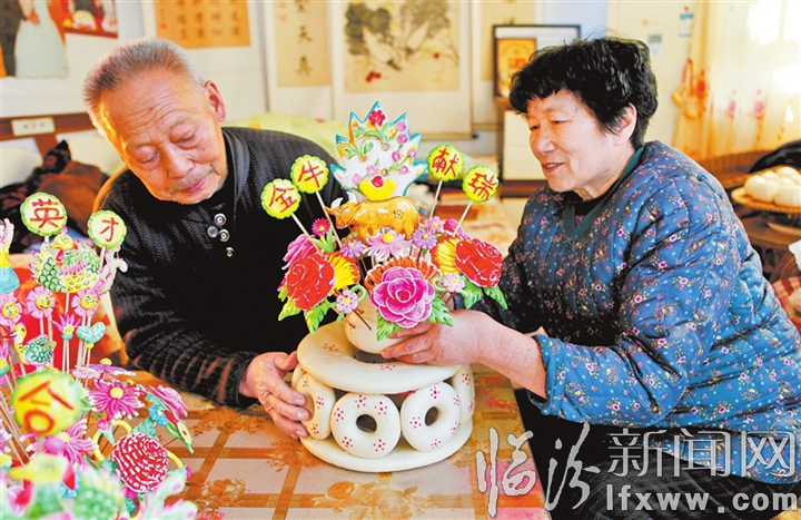 临汾新闻网讯 2020年12月30日,在襄汾县景毛乡北李村,省级“太平面塑”非遗传承人张建中、梁秋叶夫妇在制作“金牛献瑞”面塑。