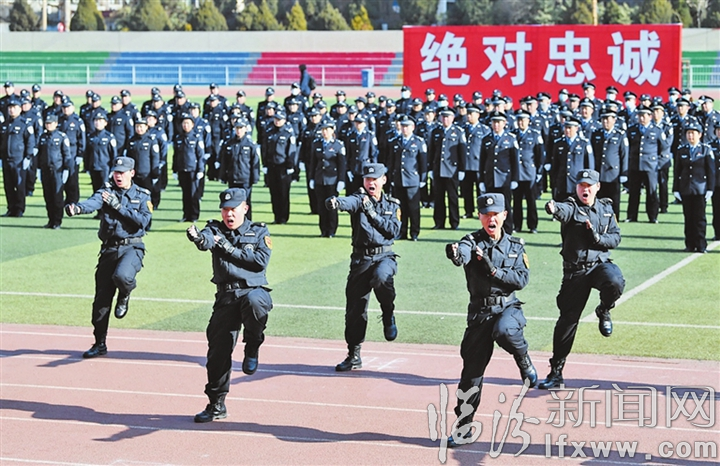 临汾新闻网讯 1月5日,市公安局直属分局举办“喜迎警察节 冬季大练兵”汇报演练活动,500余名参演干警现场展示了队列会操、擒敌拳、警务实战技能、小单元作战等科目内容,以良好的警容风貌和严整的纪律作风,迎接首个“中国人民警察节”的到来。图为演练现场。