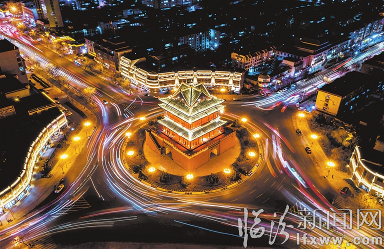 临汾新闻网讯 1月6日,航拍镜头下的鼓楼灯光璀璨。市区鼓楼南北街亮化工程以点、线、面的表现方式,烘托出城市鲜明的特性和建筑的精美,塑造了城市形象、提升了城市品质。