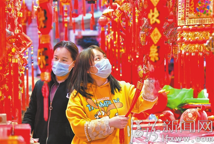 临汾新闻网讯 春节临近,年味渐浓。1月27日,在市区泽尧商贸城内,火红的中国结、对联、生肖挂件等新春饰品非常抢眼,吸引了不少顾客选购,红红火火的喜庆景象尽收眼底,节日气息浓厚。图为市民正在挑选节庆饰品挂件。