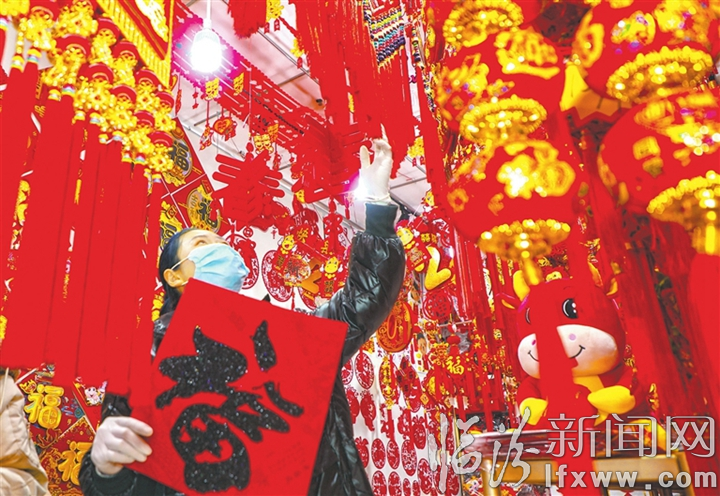 临汾新闻网讯 春节到来之际,中国结、福字、春联、牛年吉祥物等占据了市场货架主要位置,烘托出浓浓的年味儿。图为市民在我市一家商店内挑选饰品。 记者 郝海军 摄