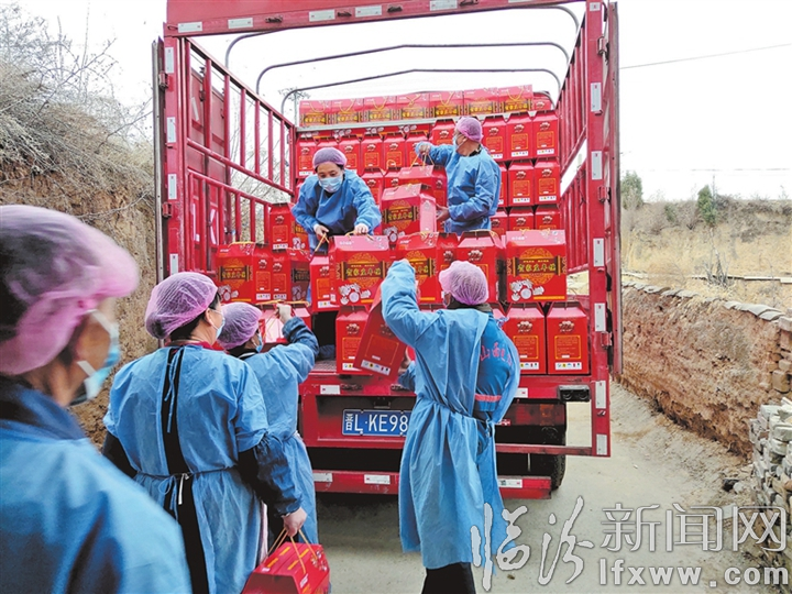 2月7日,尧都区贺家庄村民正在装运订单枣糕年馍。贺家庄枣糕年馍销售是当地百姓脱贫增收的一大产业。 王辉耀 摄