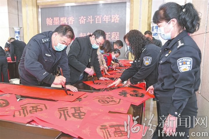 2月6日,在市公安局工会活动室,来自市书协和公安系统的书法爱好者共同书写春联。 记者 闫锐鹏 摄