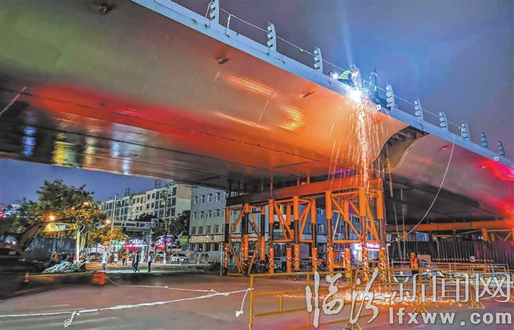 临汾新闻网讯 连日来,在市区解放东路立交桥项目施工现场,各建设单位倒排工期、昼夜施工,确保如期建成投用。图为工人正在焊接桥梁护栏。