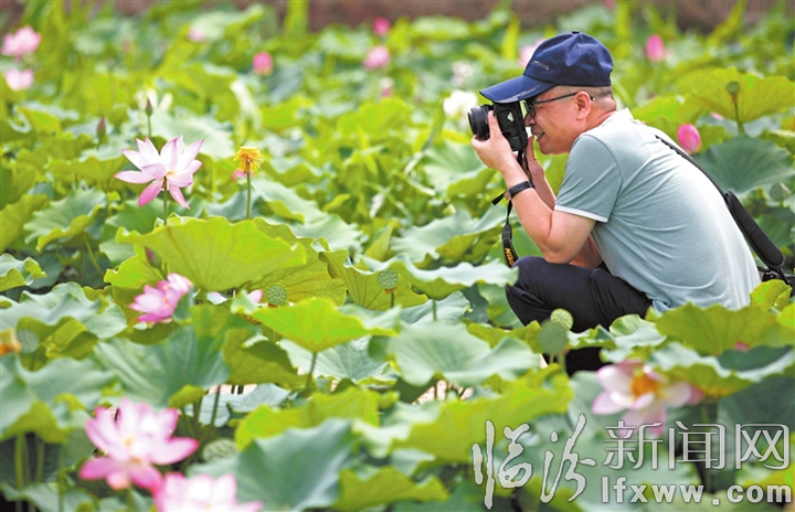 临汾新闻网讯 连日来,襄汾县邓庄镇燕村荷花小镇的荷花次第绽放,吸引不少游人前来观赏荷花。图为摄影爱好者正在拍摄荷花。