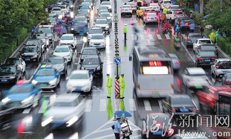 临汾新闻网讯 9月3日,市区鼓楼西街,交警在雨中疏导车辆。当日,市区出现较强降雨过程,车流量明显攀升,我市交警部门在易拥堵路段、路口增加警力,加大疏导力度,确保道路通行有序。