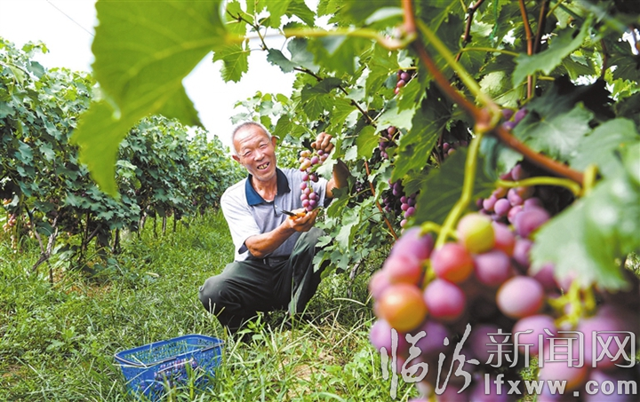 临汾新闻网讯 9月6日,尧都区县底镇河里庄村村民逯争气在展示自家种植的葡萄,今年他家种植了4亩葡萄,收入3万余元。近年来,该村大力发展葡萄种植,并采取“线上+线下”的方式进行销售,让葡萄产业成为村民的致富产业。