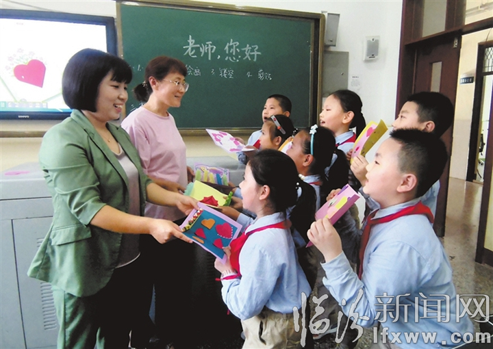 图为市第二小学学生为敬爱的老师送上一份自制的祝福贺卡,并深深地道了一声:“老师,您辛苦了!”