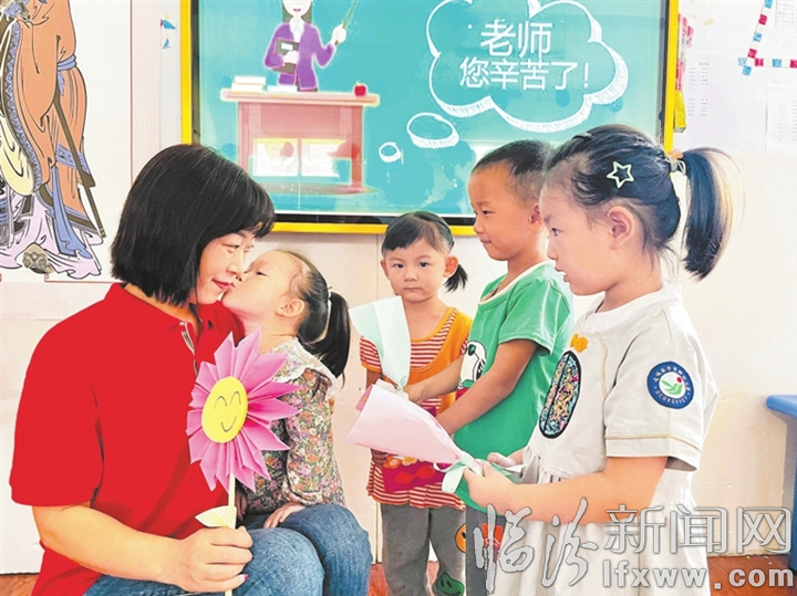 图为翼城县古城国学实验幼儿园的小朋友为老师送上亲手制作的礼物,祝老师教师节快乐。