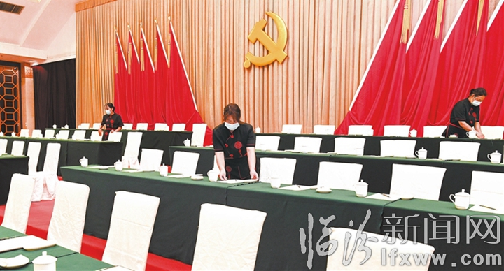 图为工作人员在布置会场。
