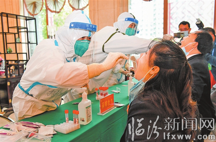 图为疫情防控工作人员为党代表、大会列席人员及工作人员进行核酸采样。