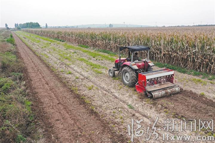临汾新闻网讯 连日来,我市广大农民抢抓有利时机进行秋收秋种,确保来年小麦丰产丰收。图为襄汾县赵康镇小赵村村民正在利用播种机抢种冬小麦。